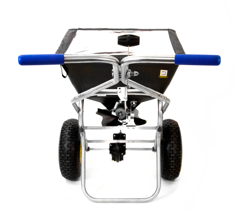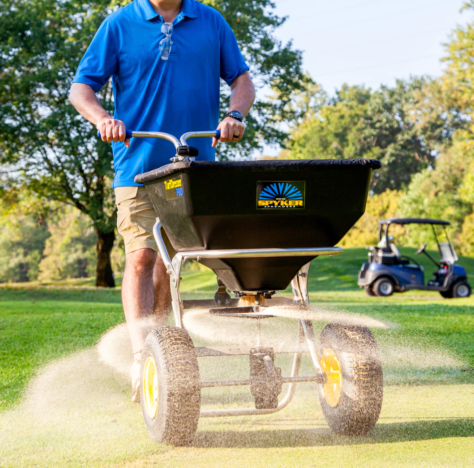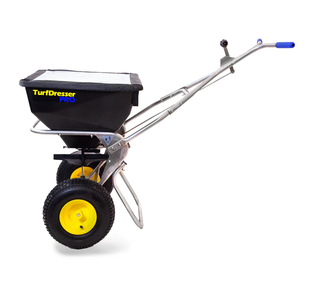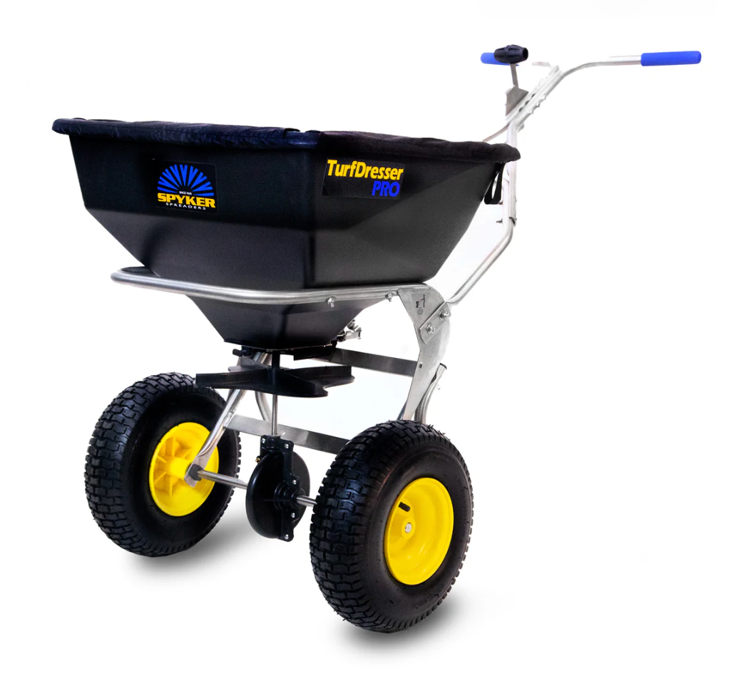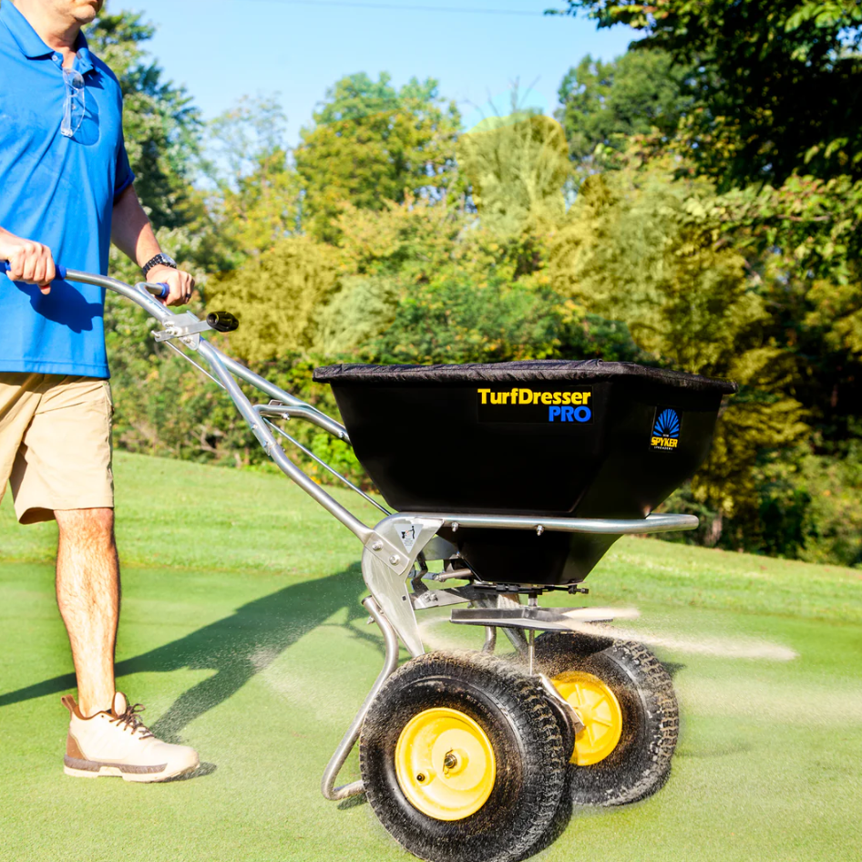 Spyker's SPY80-1S-TD TurfDresser PRO combines an injection molded high-capacity HDPE, funnel-shaped fully emptying hopper and includes the quick-change patent-pending top-dressing kit and side-deflector. Designed to switch from regular spreading to top-dressing, this 1.8 Cu.Ft. capacity spreader makes top-dressing of tee-boxes and greens a breeze. The large 13” x 5” turf tread tires create a smooth and efficient spreader roll. The adjustable handles increase comfort and ensure a level hopper/spinner when spreading. Easy operation calibration and on/off controls make operation simple, while the Spyker Accuway ensures dead-center spread distribution for the best results.